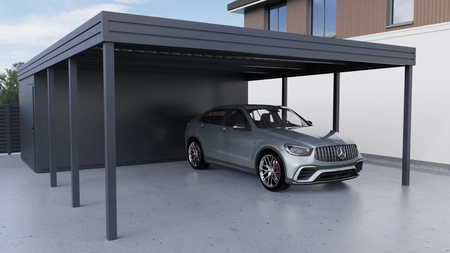 - Přístřešek pro auto se zadním úložným prostorem má ocelovou konstrukci s žárovým zinkováním a práškovým lakováním. Kombinuje kryté parkovací stání s uzavřenou technickou místností, která poskytuje ochranu vozidla a úložný prostor.