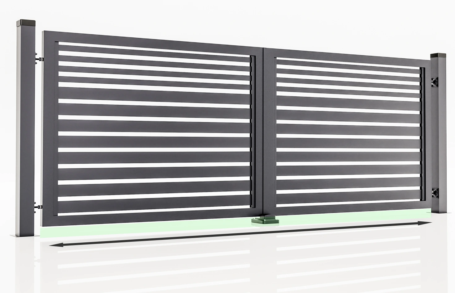 - Prestige Horizontální křídlová brána: práškově lakovaná pozinkovaná ocel, barva RAL 7016. Rozměry: šířka mezi sloupy 350-450 cm, výška 125-160 cm. Lamely 4/8 cm, vůle 3-4 cm. Včetně rukojeti. Žádné tyče. Možnost s pohonem k dispozici.