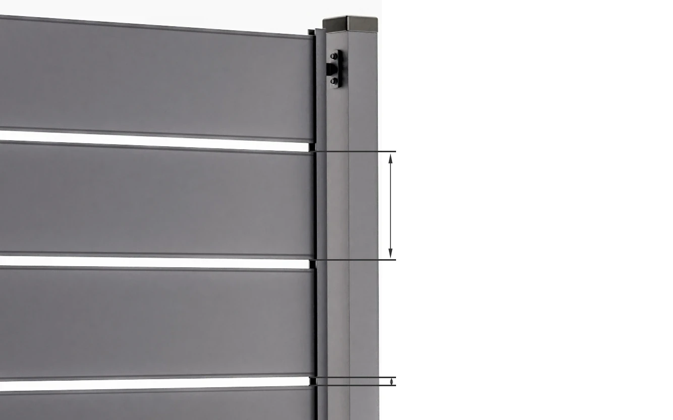 Jednotlivé žaluzie jsou široké 200 až 280 mm a viditelná vzdálenost mezi nimi je přibližně 30-40 mm. Tyto proporce zajišťují vysokou úroveň diskrétnosti a moderní, pevný vzhled plotu, který dokonale ladí s architekturou současných nemovitostí.