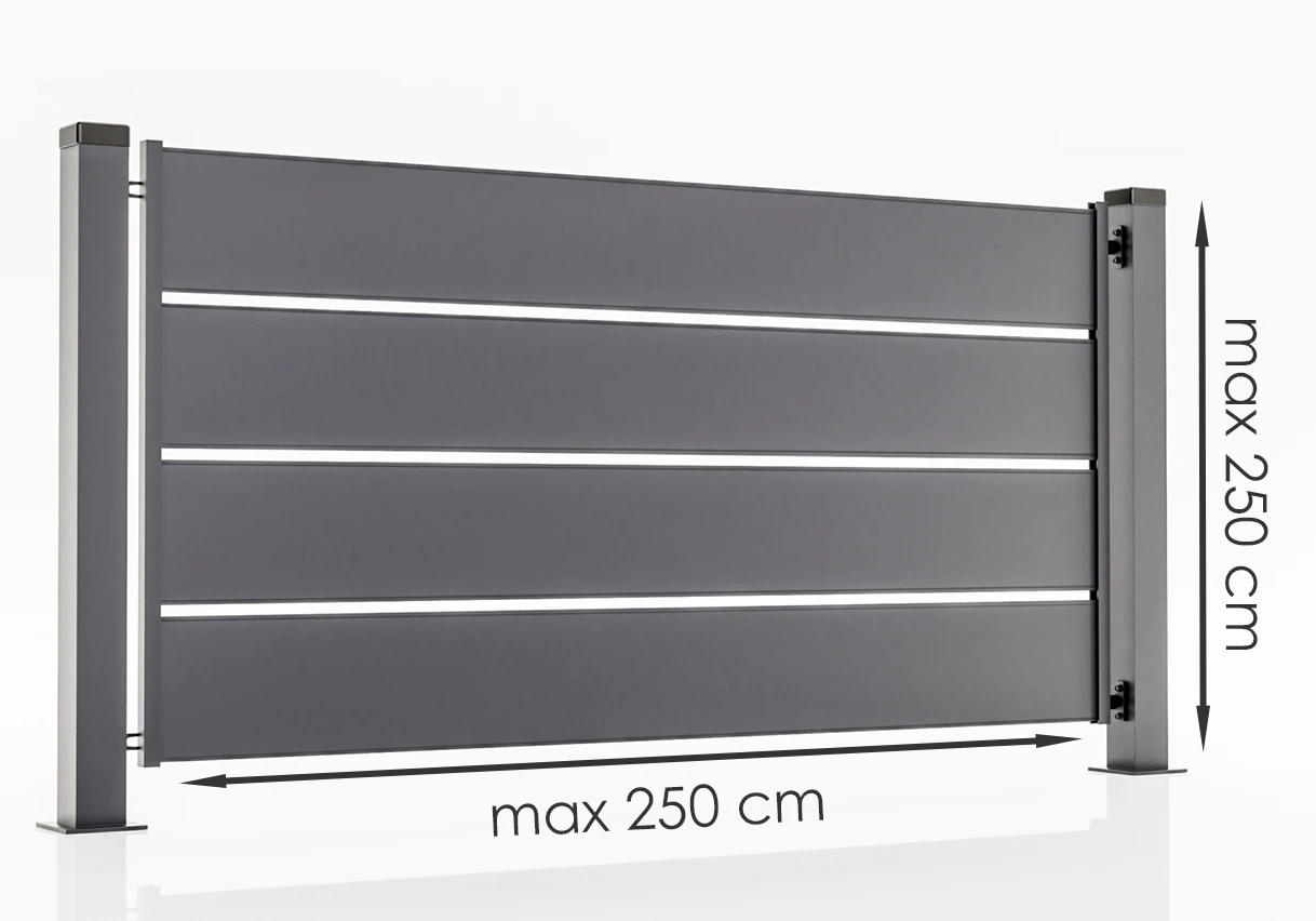 Jednotlivé žaluzie jsou široké 200 až 280 mm a viditelná vzdálenost mezi nimi je přibližně 30-40 mm. Tyto proporce zajišťují vysokou úroveň diskrétnosti a moderní, pevný vzhled plotu, který dokonale ladí s architekturou současných nemovitostí.