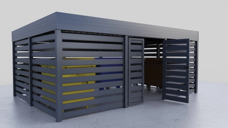 Moderní přístřešek na odpad je praktické a estetické řešení pro bytová družstva, společenství vlastníků, firmy a instituce, které chtějí dbát na pořádek a upravený vzhled okolí. Vyrobený z žárově pozinkované a práškově lakované oceli, zaručuje výjimečnou odolnost proti korozi, mechanickému poškození a proměnlivým povětrnostním podmínkám. Široké dvoukřídlé dveře umožňují snadné vysunutí kontejnerů. Šířka jednotlivé lamely činí cca 100 mm a šířka mezery cca 30–40 mm. Je tak zachována dobrá ventilace, která zároveň chrání kontejnery před vniknutím větších zvířat.