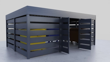 Moderní odpadový přístřešek je praktické a estetické řešení pro společenství a bytová družstva, firmy a instituce, které chtějí dbát na pořádek a upravený vzhled okolí. Vyroben z žárově zinkované a práškově lakované oceli, zaručuje výjimečnou odolnost proti korozi, mechanickému poškození a proměnlivým povětrnostním podmínkám. Široké dvoukřídlé dveře umožňují pohodlné vysunutí kontejnerů. Vyznačuje se mimořádně širokými lamelami (29 cm). Mezera mezi lamelami od 40 mm.