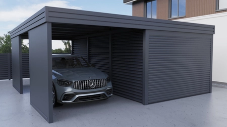 - Dvoudílná konstrukce typu přístřešek s garáží umožňuje oddělení užitných funkcí - otevřená část slouží jako parkovací místo, zatímco uzavřená garáž umožňuje uskladnění vozidel nebo vybavení.