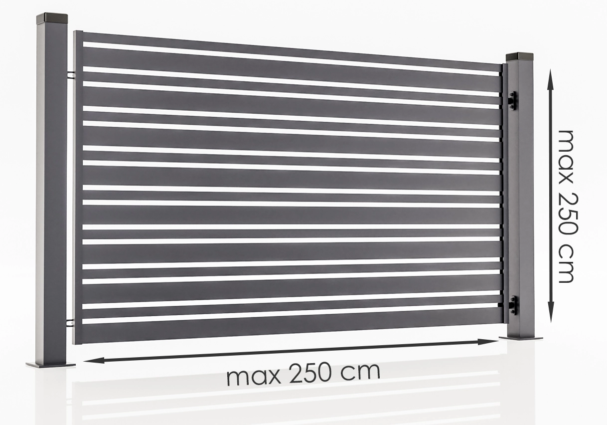 - Vodorovný příčník Premium 200×80-140 cm s profilem 4/8 cm a světlostí 3-4 cm, práškově lakovaná pozinkovaná ocel, barva RAL 7016. Bezešvý systém, povrchová úprava Hairflon®, žádné sloupky, 10letá záruka.