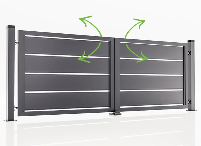V závislosti na vašich preferencích a podmínkách budovy může být dvoukřídlá brána navržena tak, aby se otevírala dovnitř objektu nebo ven směrem k východu. Z bezpečnostních důvodů doporučujeme zvolit bránu, která se otevírá dovnitř, zejména pokud se brána nachází v blízkosti hranice pozemku nebo přímo na veřejné komunikaci.