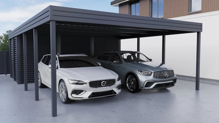 Carport für zwei Autos ohne Seitenwände mit hinterem Abstellraum aus Profilstahl des Typs Wellblech ist eine funktionelle und geräumige Kontruktion. Das Vordach schützt die Fahrzeuge vor Sonne, Regen und Hagel, und die offene Form bietet freien Zugang. Ein Raum auf der Rückseite bietet einen praktischen Platz für Werkzeuge, Fahrräder oder Gartengeräte.
