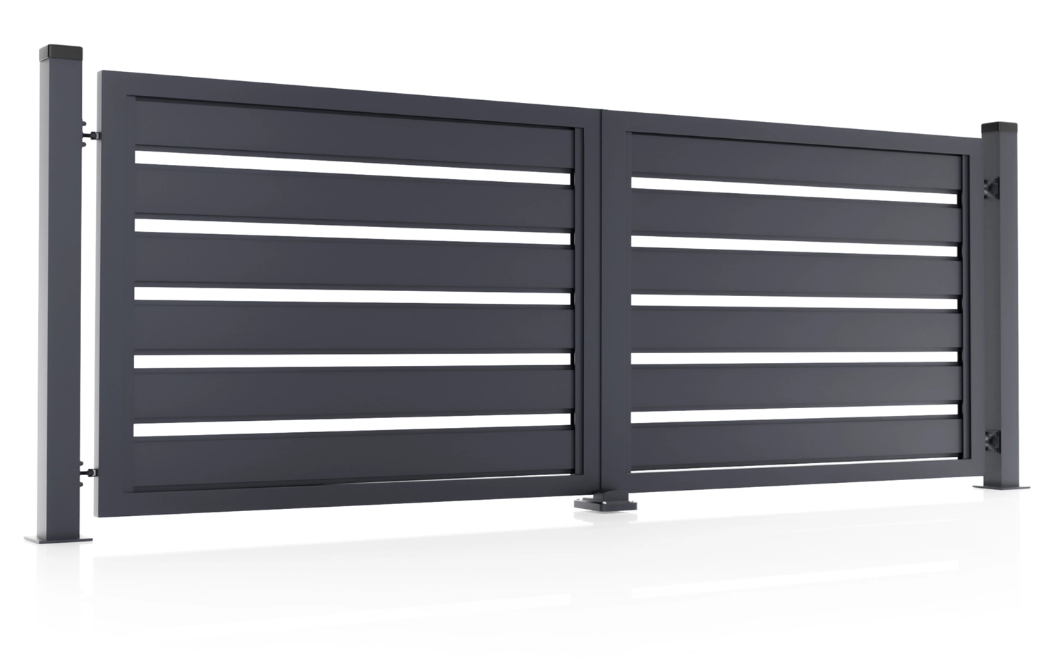 - Horizontales zweiflügeliges Stahltor, Breite 334-434 cm, Höhe 125-140 cm, Latten 15 cm mit 3-4 cm Abstand. Feuerverzinkter Stahl, Hairflon®-Beschichtung, Farbe RAL 7016, inkl. Griff, optional automatisiert. Garantie 10 Jahre.