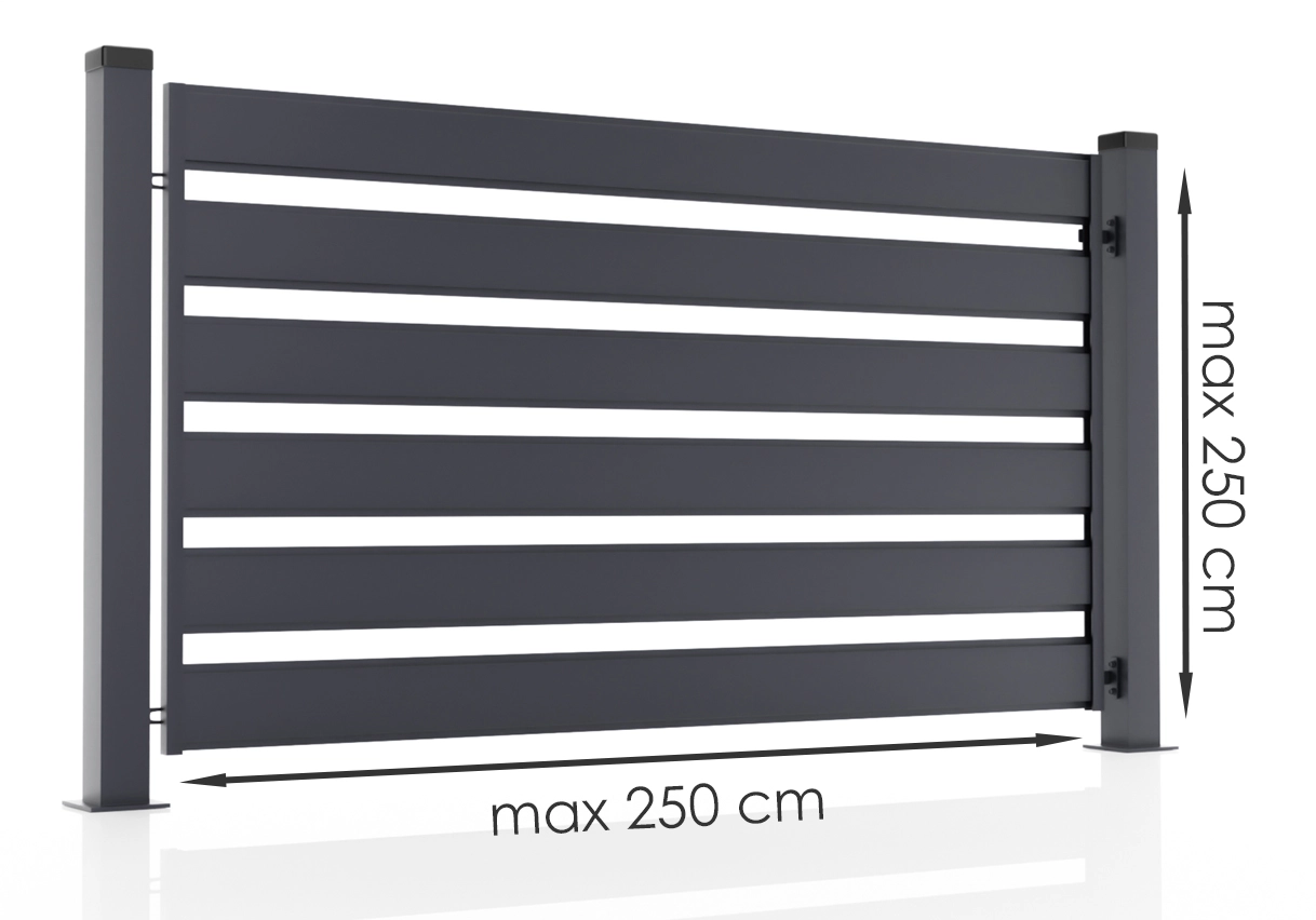 - Horizontales Feld 200 cm, Stahl verzinkt, Lamellenprofile 15 cm, Abstand 3-4 cm, pulverbeschichtet RAL 7016, Hairflon®-Schutzbeschichtung, nahtlose Montage, Garantie 10 Jahre.