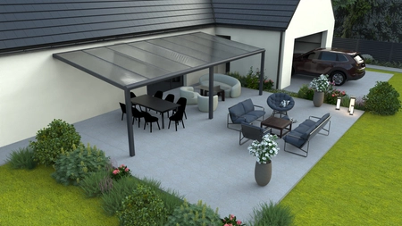Zusätzlicher Raum, den Sie nach Belieben nutzen können. Entspannungsbereich, Wintergarten, zusätzlicher Stauraum... Genießen Sie bei jedem Wetter den Aufenthalt im Freien. Beschatten Sie den Innenraum an einem windigen Tag, öffnen Sie die Schiebetüren bei Sommerwetter.