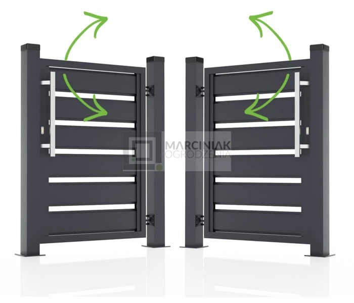 Die von Marciniak Ogrodzenia angebotenen Pforten können entweder links oder rechts und nach innen oder außen offen sein. Die Wahl der Öffnungsrichtung sollte an die Umgebung angepasst werden - es lohnt sich, auf den verfügbaren Platz zu achten, um vollen Nutzungskomfort zu gewährleisten.