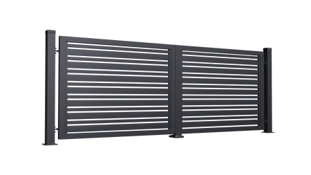 - Brama Skrzydłowa Horyzontal Premium: 350–450 cm szer., 125–160 cm wys., stal ocynkowana, malowana proszkowo. Lamele 4/8 cm, prześwit 2,5–3 cm. Klamka lub uchwyt pod automat. Bez słupów. Opcja ręczna lub z napędem.