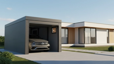 Nowoczesny garaż ocieplany z płyt PIR o grubości 6 cm to solidne i estetyczne rozwiązanie przeznaczone do całorocznego użytkowania. Prosta, minimalistyczna forma w kolorze RAL 7016 – antracyt doskonale komponuje się z nowoczesną architekturą domów jednorodzinnych oraz zabudową miejską. Garaż standardowo wyposażony jest w bramę segmentową Hörmann RenoMatic o wymiarach 250 × 225 cm w wersji ręcznej. Istnieje możliwość doposażenia bramy w napęd elektryczny (opcja dodatkowo płatna). Bramy dostępne są w szerokiej gamie kolorów w strukturze Woodgrain. W cenie garażu zawarte są drzwi techniczne Hörmann, zapewniające wygodny dostęp do wnętrza, a także okno PCV o wymiarach 80 × 60 cm, które doświetla przestrzeń użytkową. Kolor bazowy paneli PIR: RAL 7016 – Antracyt