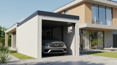Nowoczesny garaż ocieplany wykonany z płyt PIR o grubości 6 cm to trwałe i estetyczne rozwiązanie do całorocznego użytkowania. Prosta, minimalistyczna bryła oraz jasna kolorystyka RAL 9010 – złamana biel doskonale wpisują się w nowoczesną architekturę domów jednorodzinnych i zabudowy miejskiej. Ściany oraz dach garażu wykonane są z wysokiej jakości płyt PIR o grubości 6 cm, które charakteryzują się bardzo dobrą izolacyjnością cieplną oraz odpornością na wilgoć. Dzięki temu wnętrze garażu jest skutecznie chronione przed stratami ciepła zimą oraz nadmiernym nagrzewaniem latem. Garaż wyposażony jest w bramę segmentową Hörmann RenoMatic w rozmiarze 250×225 cm w wersji ręcznej, z możliwością doposażenia w napęd elektryczny (opcja dodatkowo płatna). Bramy dostępne są w szerokiej gamie kolorów w strukturze Woodgrain. W cenie garażu zawarte są drzwi techniczne Hörmann, zapewniające wygodny dostęp do wnętrza oraz okno PCV 80×60 cm. Kolor bazowy paneli PIR: Złamana Biel (RAL 9010). Garaż zabudowany ścianą (6 wypełnień bocznych + 2 tylne) z wysokoodpornej i izolującej płyty PIR o grubości 60mm.