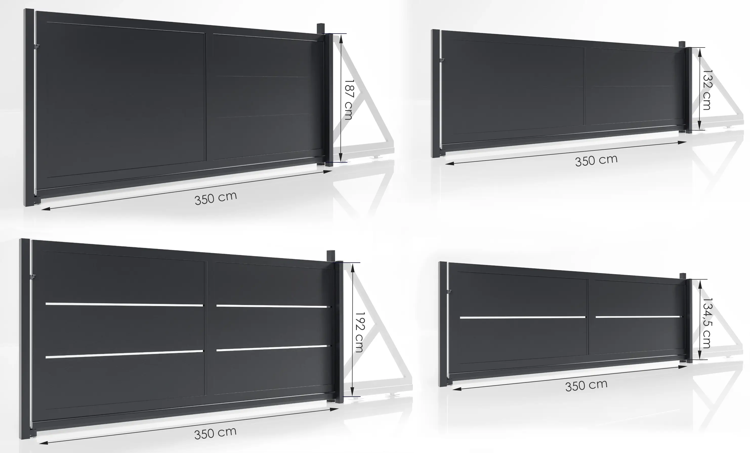 - Brama przesuwna 350×141-200,5 cm, profile 3 cm, prześwit 0–2 cm, stal ocynkowana malowana proszkowo, wypełnienie styrodur, kolor RAL 7016, powłoka Hairflon®, klamka, gwarancja 10 lat.