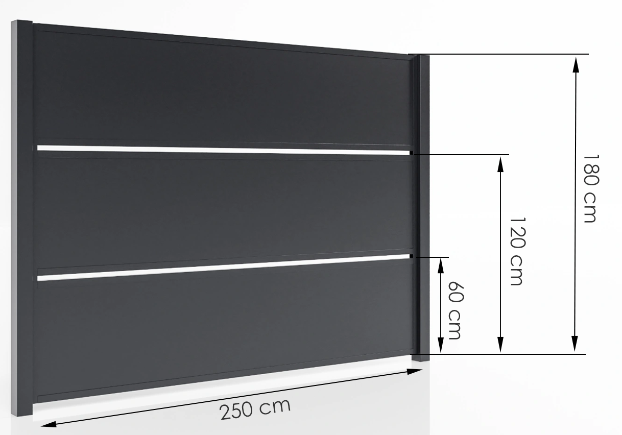 - Przęsło modułowe 250 cm, szerokość z uchwytem 253 cm, profile 3 cm, prześwit 0–2 cm, stal ocynkowana malowana proszkowo, wypełnienie styrodur, kolor RAL 7016, powłoka Hairflon®, bez słupków, gwarancja 10 lat.