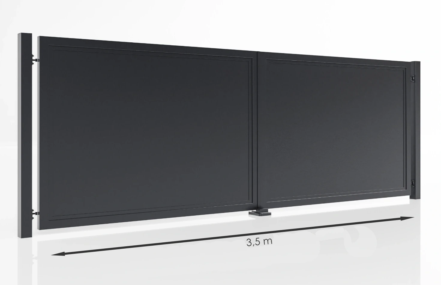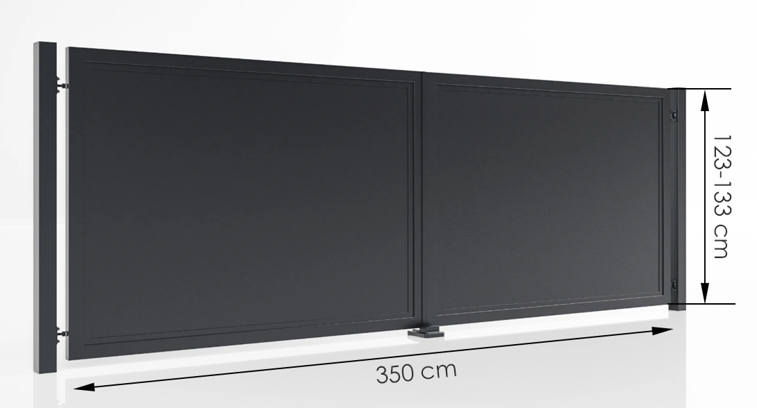- Szerokość wjazdu 350 cm, wysokość 123 lub 133 cm. Stal ocynkowana, brak prześwitów, wypełnienie styrodur, kolor RAL 7016 antracyt. Klamka w zestawie, słupy do dokupienia osobno. Możliwość automatyki lub ręcznego otwierania.